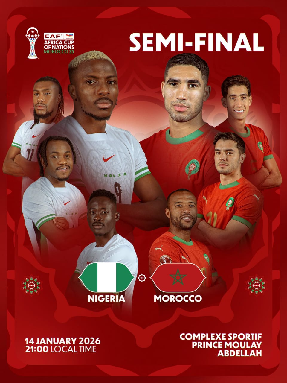 The 2025 Africa Cup of Nations is nearing its climax as Nigeria’s Super Eagles take on host nation Morocco in a blockbuster semi-final encounter later today in Rabat. With a place in Sunday’s final at stake, two of Africa’s football heavyweights are set for a fiercely contested showdown.