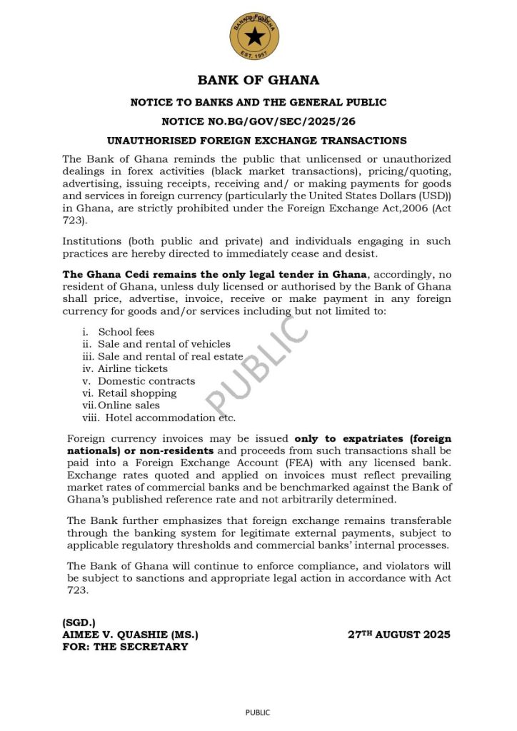 According to the notice, which was signed by the Bank’s secretary, Mrs. Aimee V. Quashie, “the Ghana cedi remains the only legal tender in Ghana.” It further said that no Ghanaian citizen may price, promote, invoice, or accept payment in any foreign currency unless properly licensed or authorized by the Bank of Ghana.