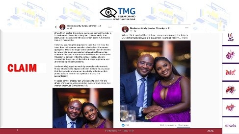A viral image shared by social media accounts, including a Facebook post by “Boutrous Andy Kwaku Yirenkyi,” claims to show former Vice President Dr. Mahamudu Bawumia with a young woman. The post alleges that the lady is Bawumia’s daughter and uses the image to question the “standards associated with political leadership” and “discipline” within his family.