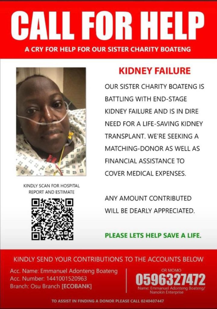 “Our sister Charity Boateng is battling with end-stage kidney failure and is in dire need of a life-saving transplant,” the family said in a statement.