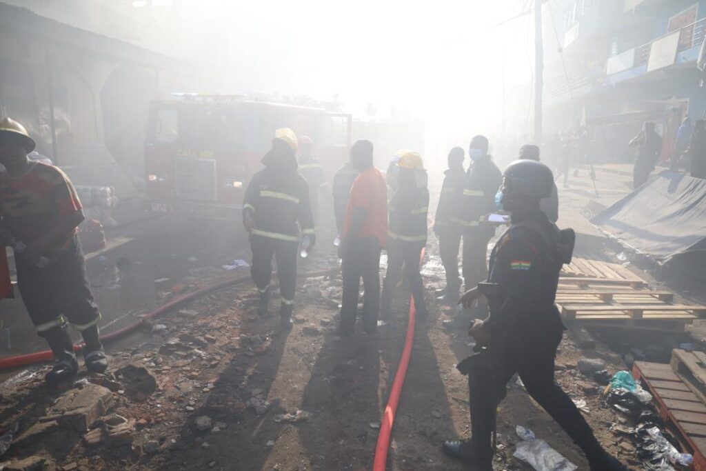 The Ghana Police provided operational support to the Ghana National Fire Service as they worked to put out a fire that engulfed a section of the Kantamanto market in Accra.