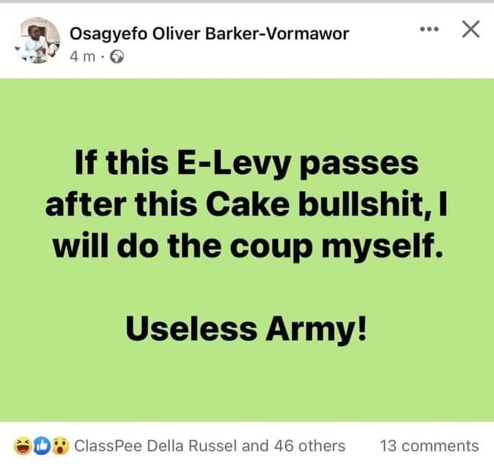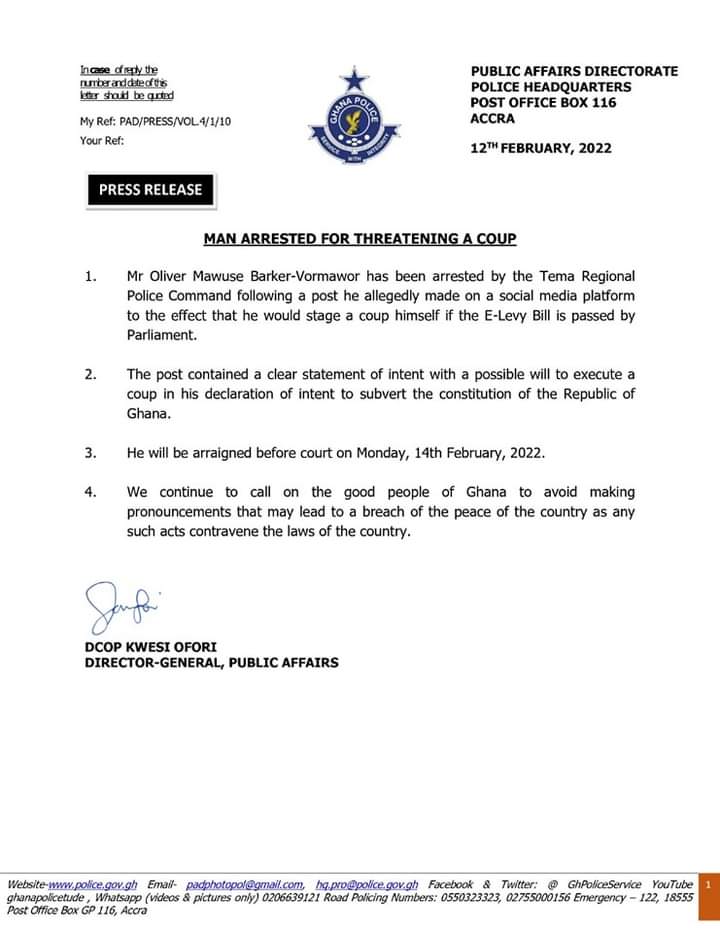 A lawyer and leader of the #Fixthecountry movement, Mr Oliver Mawuse Barker-Vormawor has been arrested by the Tema Regional Police for threatening to stage a coup to topple government if the E-Levy bill is passed.