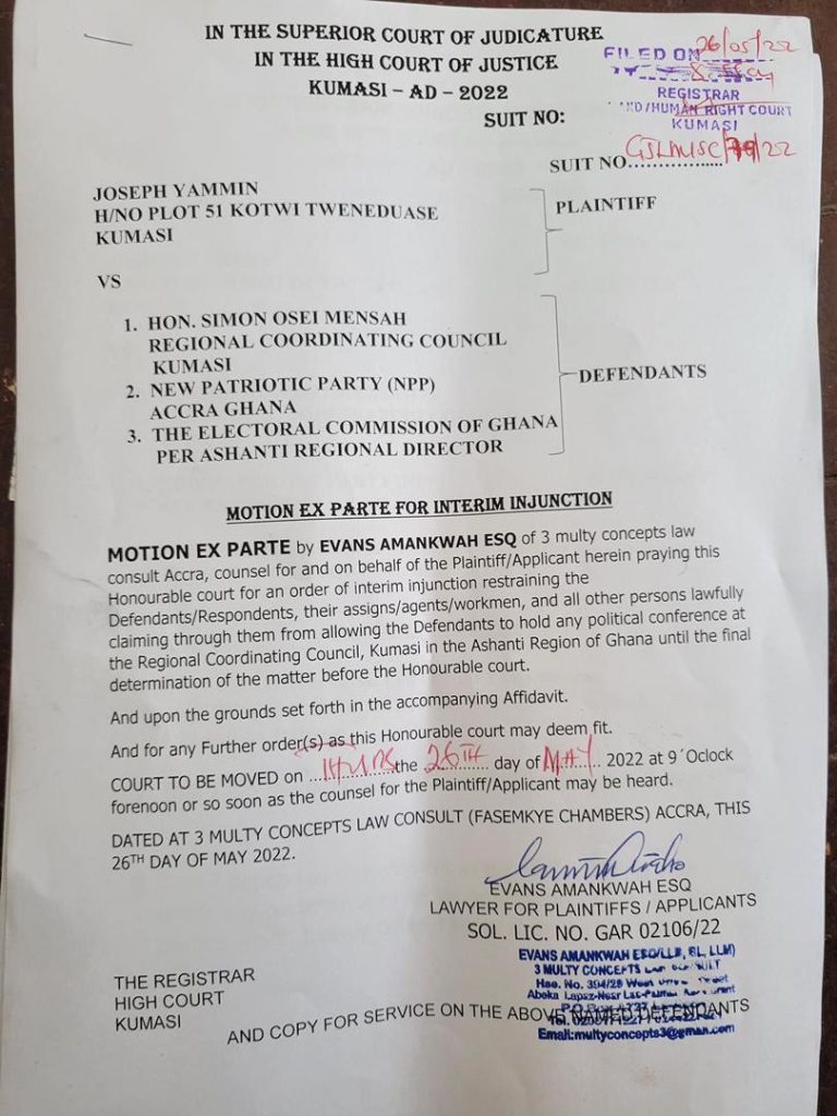 Although the election comes off on Saturday May 27 to May 29, 2022, Joseph Yammin has secured a High Court injunction against the use of the Ashanti Regional Coordinating Council (RCC) as venue NPP Ashanti regional executive elections.