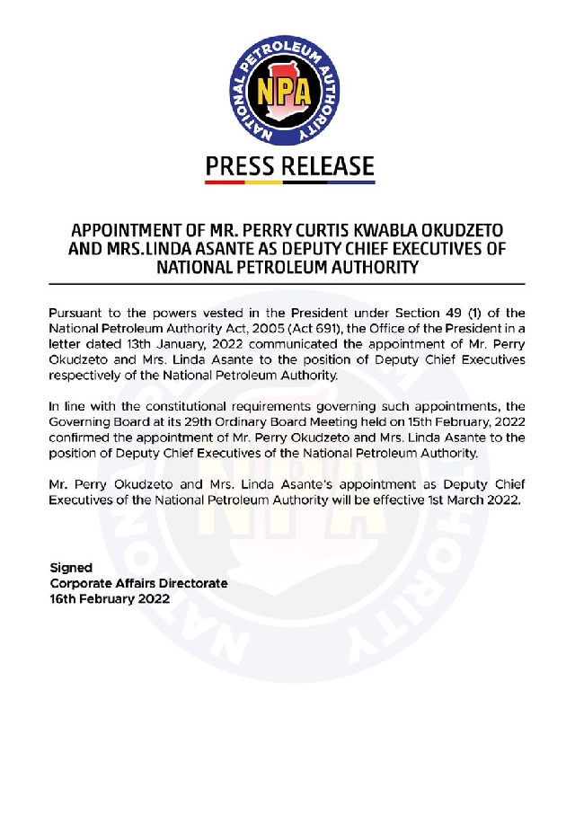 A statement by the NPA noted that Pursuant to the power vested in the President, Nana Addo Dankwa Akufo-Addo has appointed Mr Perry Okudzeto and Mrs Linda Asante to the position of deputy Chief Executives respectively of the National Petroleum Authority (NPA).
