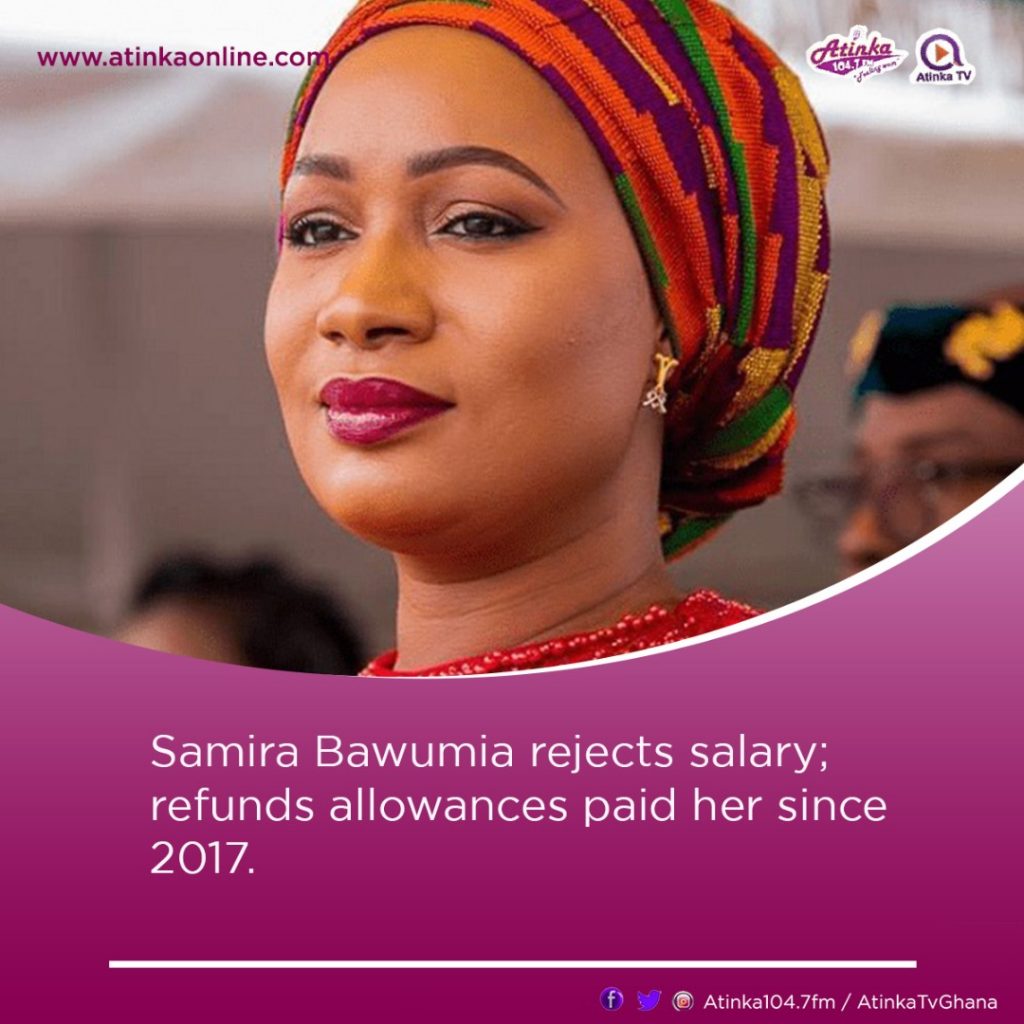 The Second lady, Mrs Samira Bawumia has stated that she will refund all allowances paid to her since 2017 and will not accept any monies allocated to her pursuant to the recommendations of the Prof. Yaa Ntiamoa Baidu led committee, as approved by Parliament on 6th January 2021.