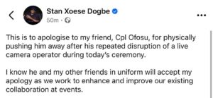 In a Facebook post later that day, Dogbe said his actions were prompted by what he described as repeated disruptions to a live camera feed. “This is to apologise to my friend, Cpl Ofosu, for physically pushing him away after his repeated disruption of a live camera operator during today’s ceremony,” he wrote.