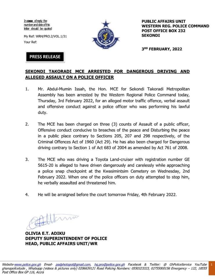 The Municipal Chief Executive (MCE) for Sekondi Takoradi in the Western Region, Abdul-Mumin Issah, has been arrested by the Police for “Dangerous Driving” and alleged assault on a police officer.”