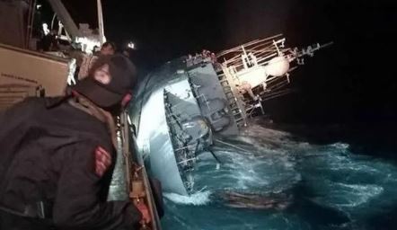 Dramatic pictures posted on the Thai Navy’s Twitter account show the vessel listing onto its side, and back-up rescue ships trying to find survivors in choppy waters.