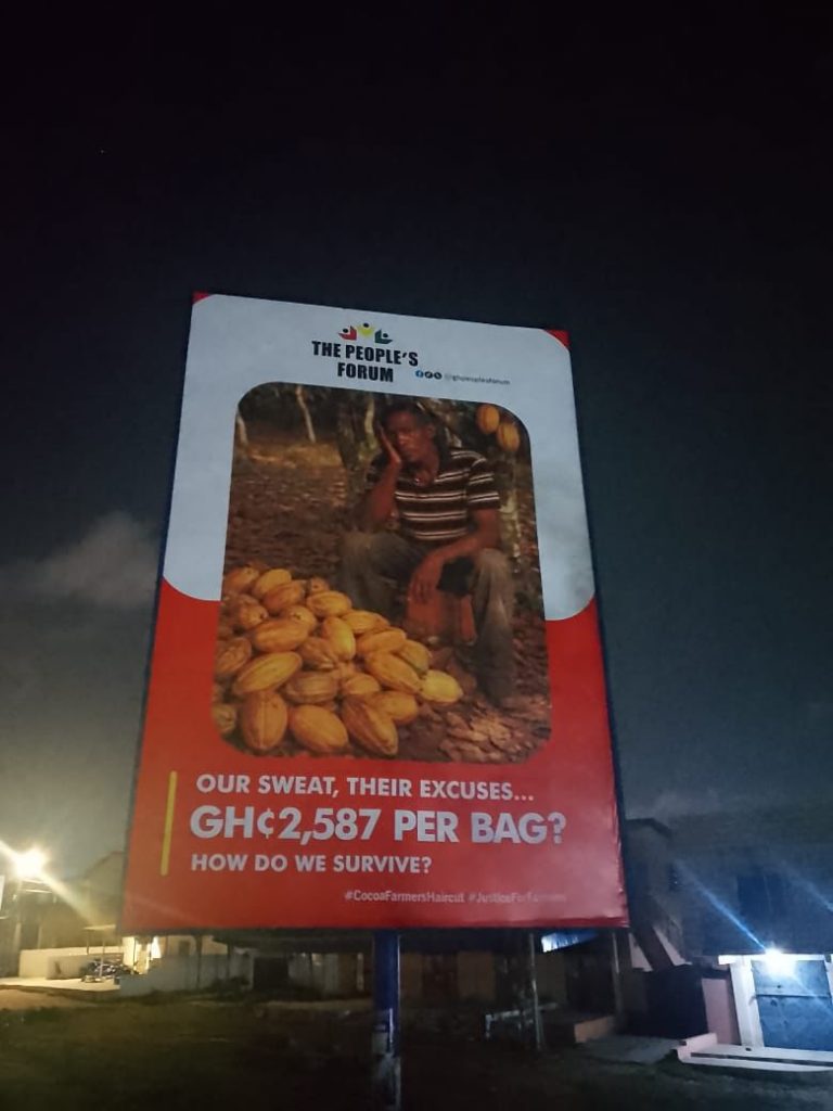The People’s Forum has launched a bold nationwide billboard campaign to amplify the growing anger among cocoa farmers following the government’s mid-season cut of the producer price to GH¢2,587 per 64kg bag.