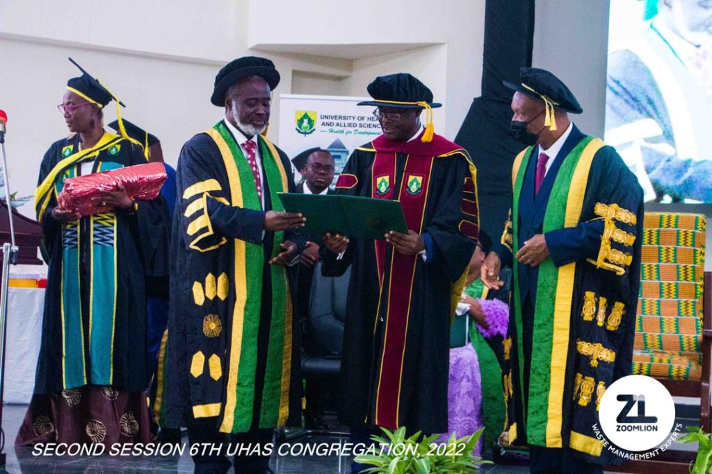 The Chairman of the Council of the UHAS, Justice Victor J.M. Dotse of the Supreme Court, and the Vice Chancellor of UHAS, Professor John Owusu Gyapong, together decorated Dr. Siaw Agyepong with the honours last Saturday at the second session of the 6th UHAS Congregation at Ho, Volta Region.