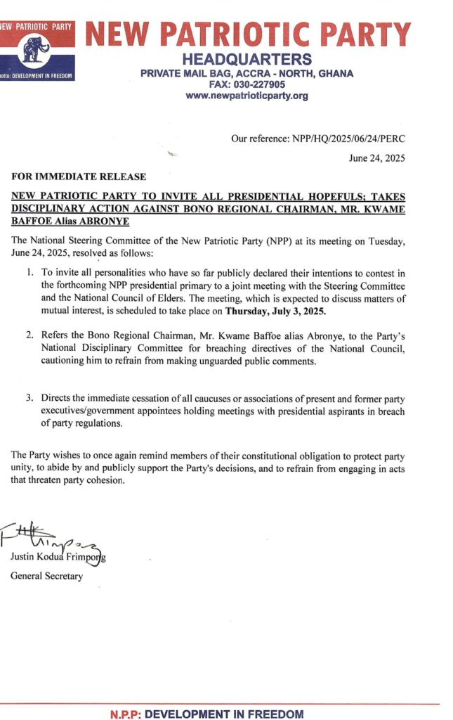 The New Patriotic Party (NPP) has referred its Bono Regional Chairman, Mr. Kwame Baffoe, popularly known as Abronye, to the party’s National Disciplinary Committee for making public statements deemed to breach internal directives and threaten party unity.