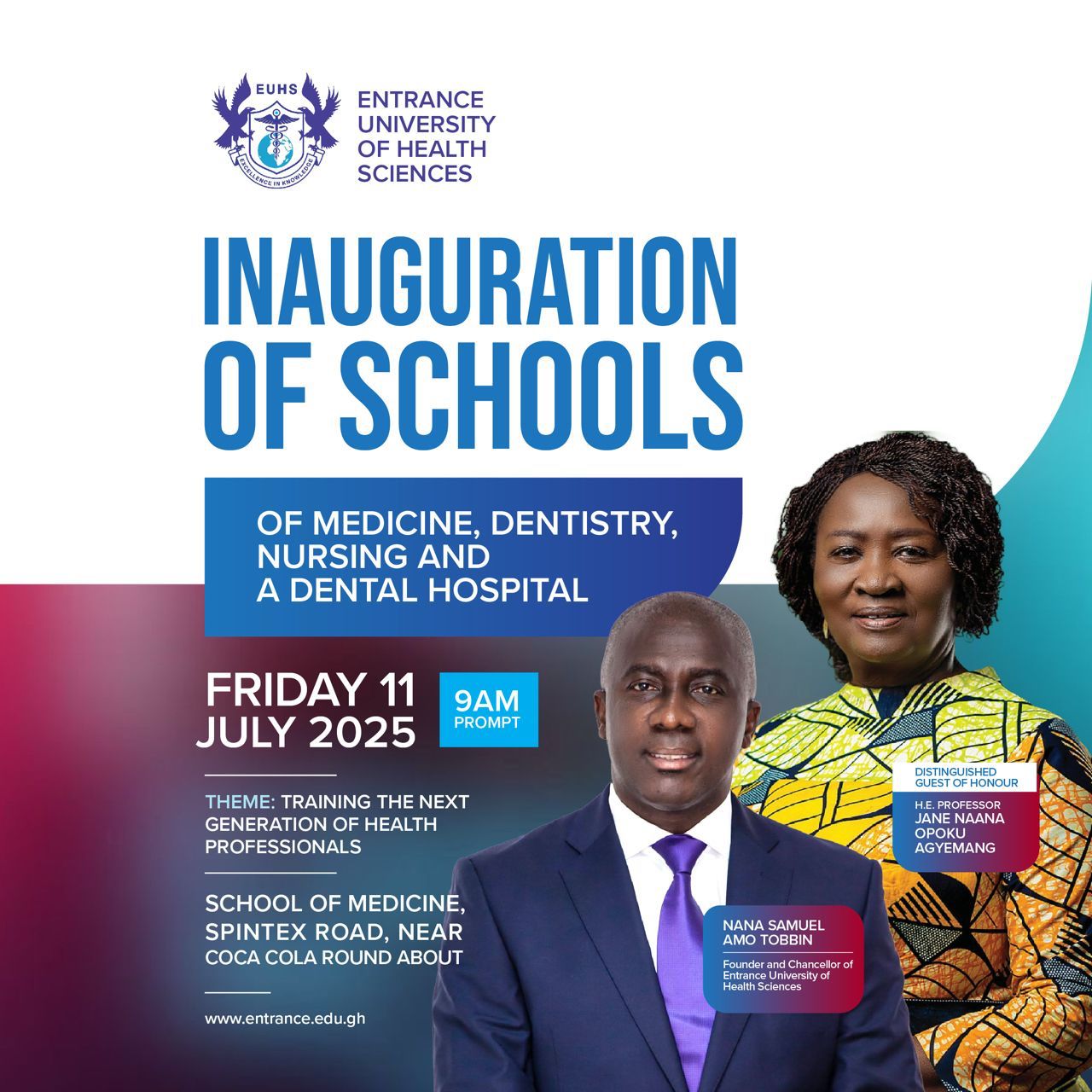 The Vice President of the Republic of Ghana, H.E. Professor Jane Naana Opoku-Agyemang, will tomorrow, July 11, 2025, grace the official inauguration of the Entrance University of Health Sciences and its constituent schools and dental hospital.